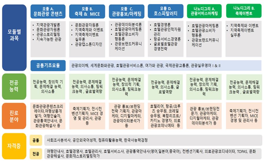 문화관광학전공은 교육과정을 4개 전문 모듈로 세분화하여, 학생들이 자신의 진로에 맞는 맞춤형 역량을 선택하고, 집중적으로 성장할 수 있도록 지원합니다.